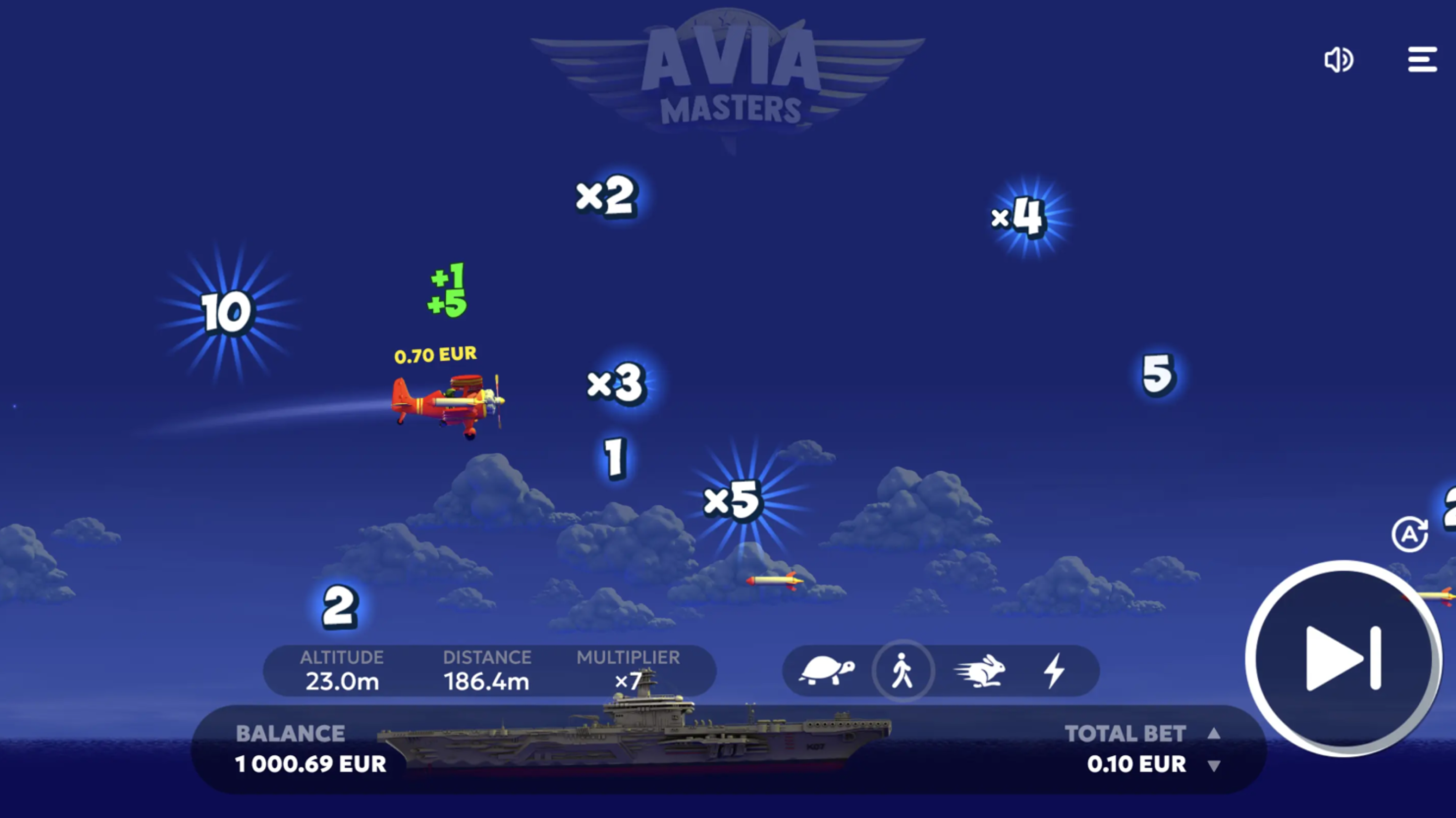 Al momento de comenzar a jugar te vas a encontrar con una mecánica tanrepetitiva y automática que más que aburrirte te va a dar risa. Para jugar a Avia Masters tenés que hacer dos cosas: elegir el valor de tu apuesta, y apretar el botón de juego. Entonces, ves cómo el avión surca el aire atrapando objetos hasta que finaliza su recorrido, es decir, aterriza en el barco o choca con el agua y se hunde dejándote perplejo y diciéndole adiós a tu plata de la apuesta.